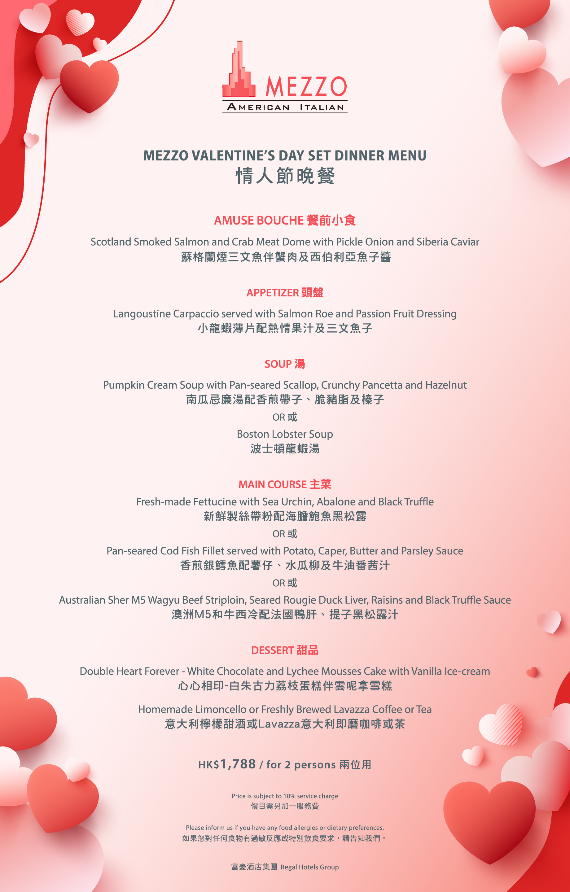 Mezzo creates a romantic and memorable holiday for you, presenting a Valentine's Day dinner to be shared with your loved one. Indulge in a feast of exquisite cuisine specially crafted to delight your taste buds.